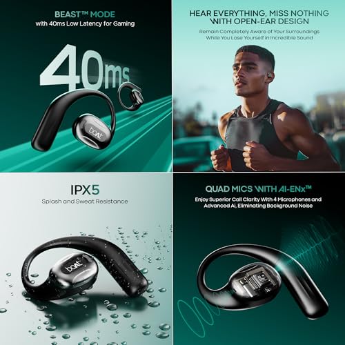 boAt Airdopes Progear Open-Ear Ear Buds for Outdoor Sports W/Air Conduction Tech,in Ear,4 Mics W/Ai-Enx, 100Hrs Playback,15Mm Drivers, Secure Fit,Beast Mode W/ 40Ms Latency, ASAP Charge(Active Black)