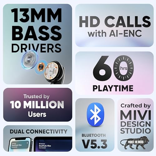 Mivi DuoPods K6 / Vibe Earbuds [New Launch], 60 Hours Playtime, AI-ENC for HD Calls, 13mm Drivers, IPX 4.0, BT v5.3, Made in India True Wireless Bluetooth Ear Buds