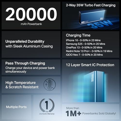 boAt Energyshroom PB435 20000 mAh 35W Super Fast Charging Power Bank, Smart 12 Layer Protection (4X Output Ports, Supports Android, iPhone, Tablets, Earbuds, etc.) (Navy Blue)