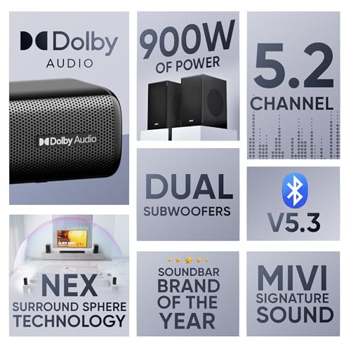 Mivi Cinematic Nex 900 Dolby Audio Soundbar (New Launch)| 900W Signature Sound | 5.2 Channel Home Theatre System with Dual Subwoofers and Satellites | Nex Surround Sphere Tech | Bluetooth v5.3