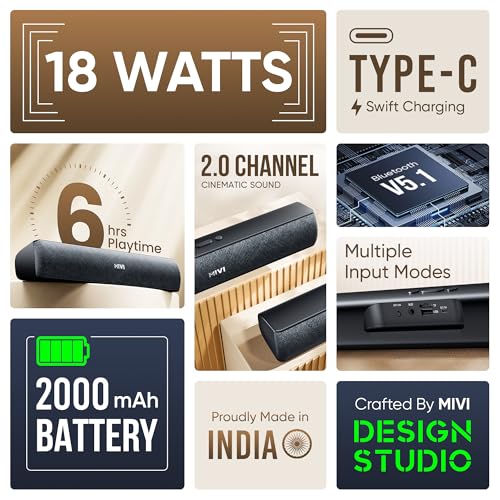 Mivi Fort R18/Q18 Soundbar with 18W Bluetooth Speakers Soundbar, 2.0 Channel with 2 in-Built Full-Range Speakers, Multiple Input Modes, 6H Playtime, 2000mAh, Made in India Sound bar for TV