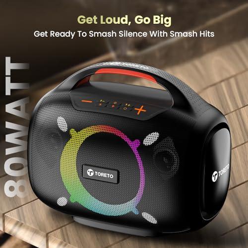Toreto Smash -2 Boombox 80W Wireless Portable Party Speaker with Bluetooth 5.3 | Dazzling RGB Light, Support TWS/USB/TF Card/AUX Input/Rechargable Wireless Mic (Black)