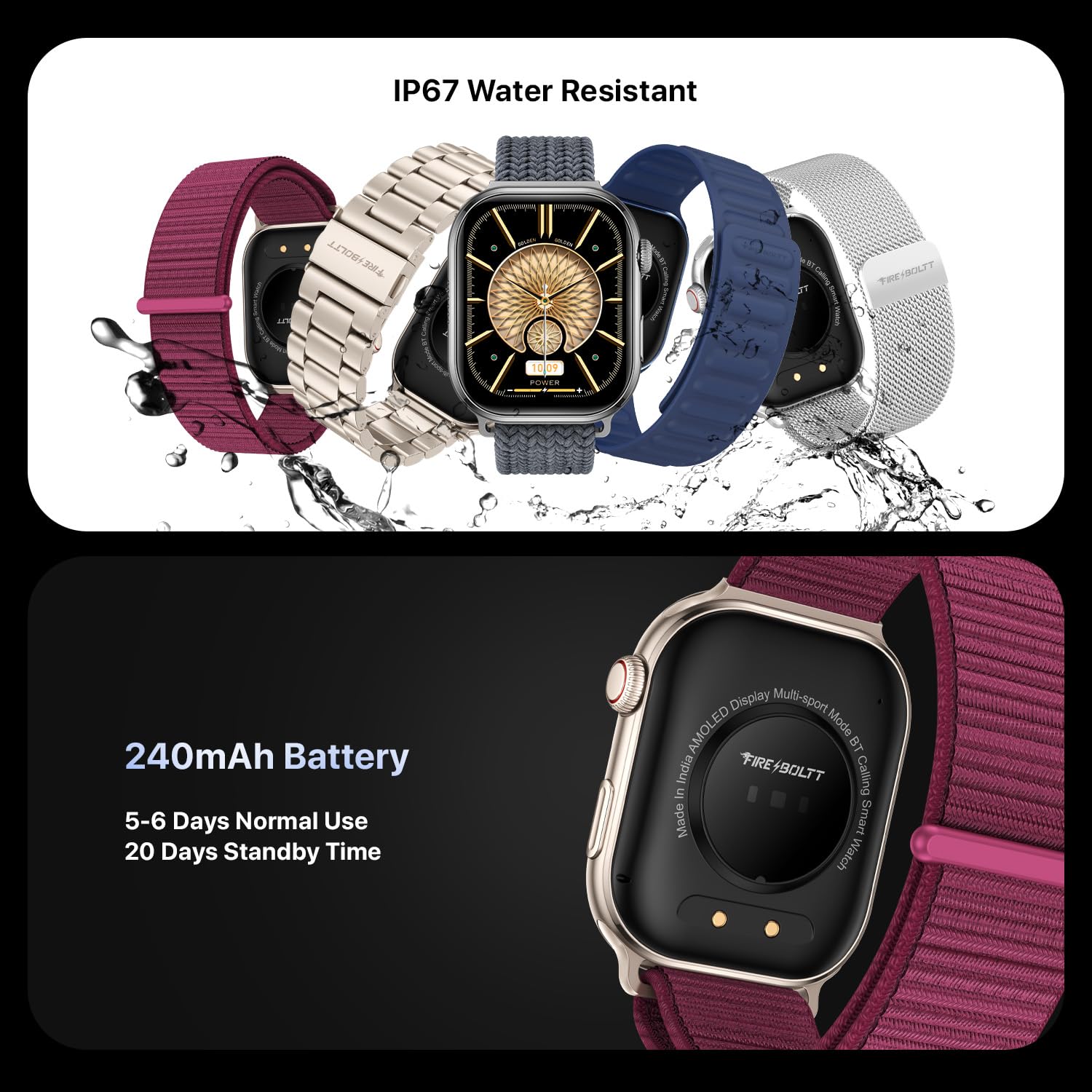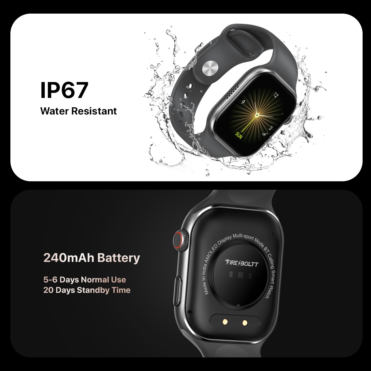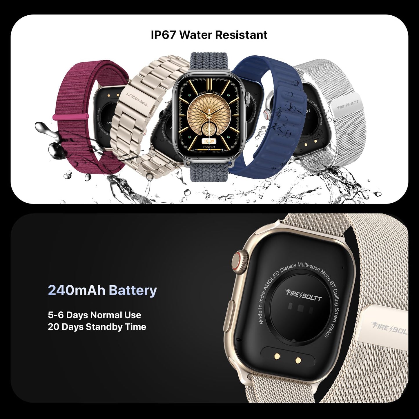 | Special Features | Accelerometer, Activity Tracker, Alarm Clock, Calorie Tracker, Camera, Bluetooth Calling, IP67 Smartwatch, 2.01" AMOLED Display, Built In Mic & Speaker, Voice Assistant, Games, Find Phone, Daily Workout Memory, Distance Tracker, Multisport Tracker, Music Player, Notifications, Pedometer, Phone Call, Sedentary Reminder, Sleep Monitor, Text message, Time Display, Spo2 (Blood Oxygen Monitoring), Heart Rate Tracking |