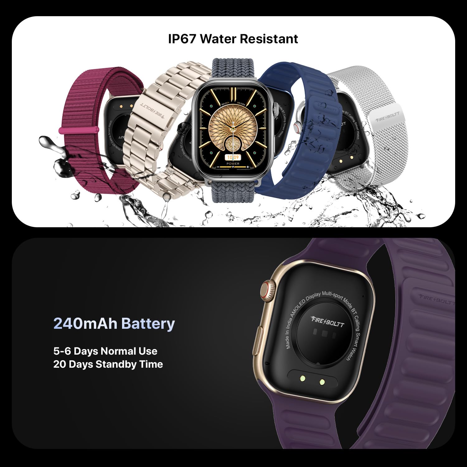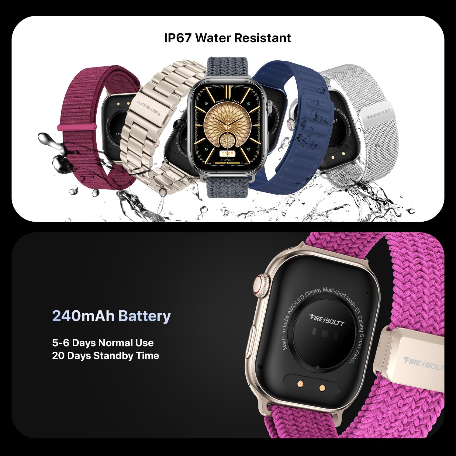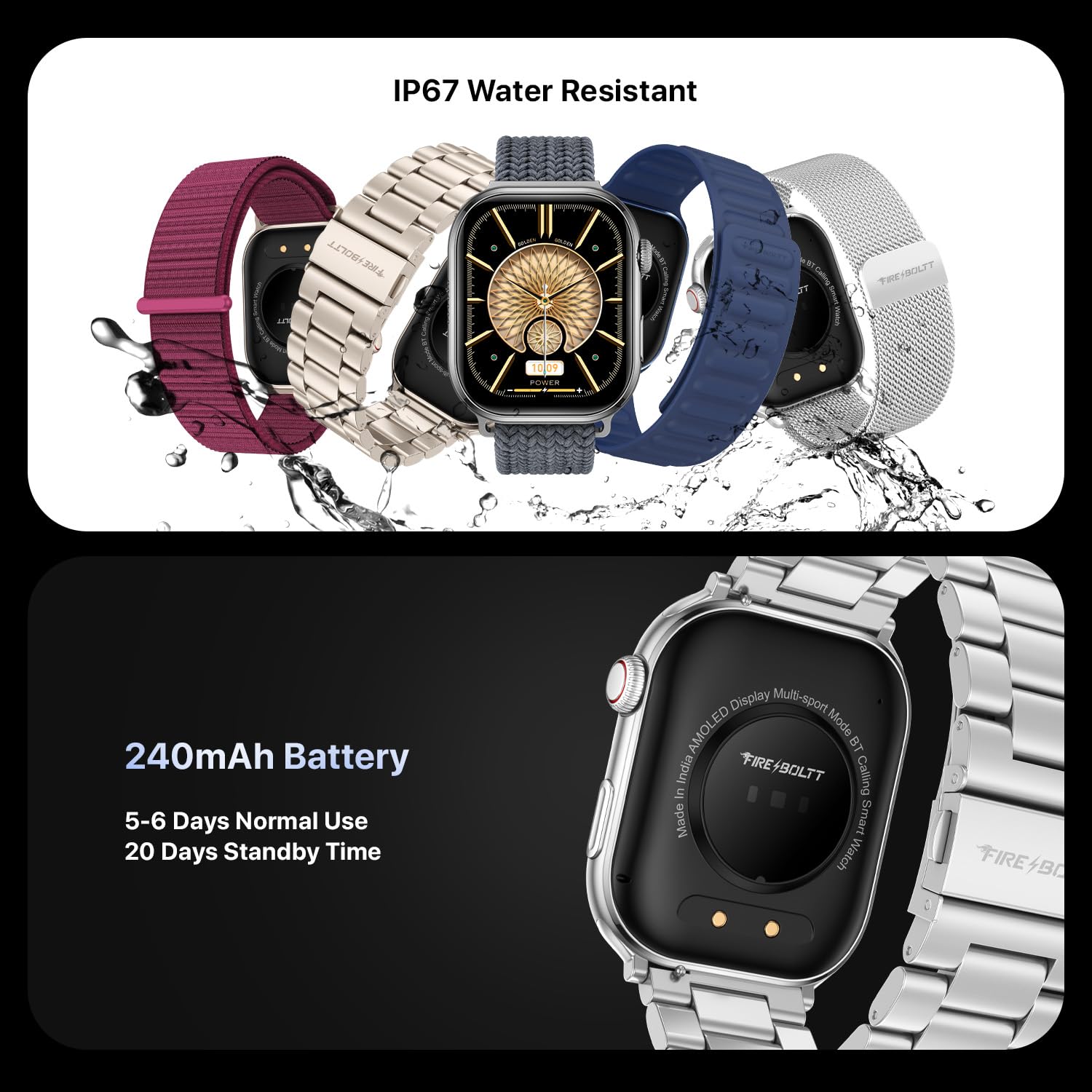 | Special Features | Accelerometer, Activity Tracker, Alarm Clock, Calorie Tracker, Camera, Bluetooth Calling, IP67 Smartwatch, 2.01" AMOLED Display, Built In Mic & Speaker, Voice Assistant, Games, Find Phone, Daily Workout Memory, Distance Tracker, Multisport Tracker, Music Player, Notifications, Pedometer, Phone Call, Sedentary Reminder, Sleep Monitor, Text message, Time Display, Spo2 (Blood Oxygen Monitoring), Heart Rate Tracking |